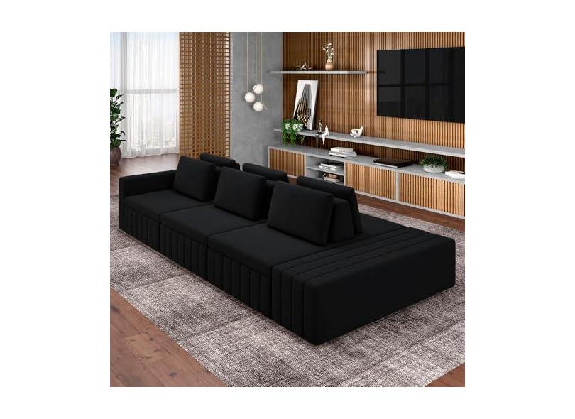 Sofá Ilha com Encosto e Almofadas Móveis Olimpo 335cm Modulado Veludo Preto G45 - Gran Belo