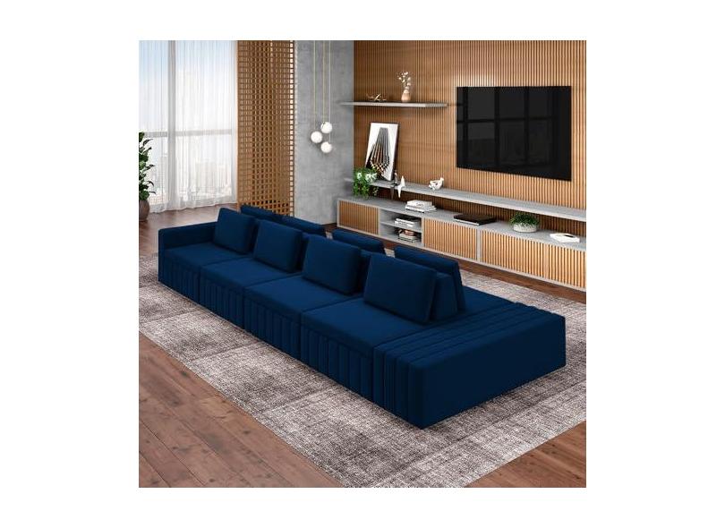 Sofá Ilha com Encosto e Almofadas Móveis Olimpo 465cm Modulado Veludo Azul Marinho G45 - Gran Belo