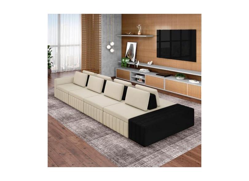 Sofá Ilha com Encosto e Almofadas Móveis Olimpo 505cm Modulado Linho/PU Bege/Preto G45 - Gran Belo