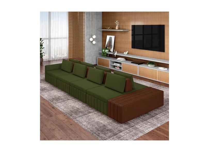 Sofá Ilha com Encosto e Almofadas Móveis Olimpo 505cm Modulado Linho/PU Verde/Marrom G45 - Gran Belo