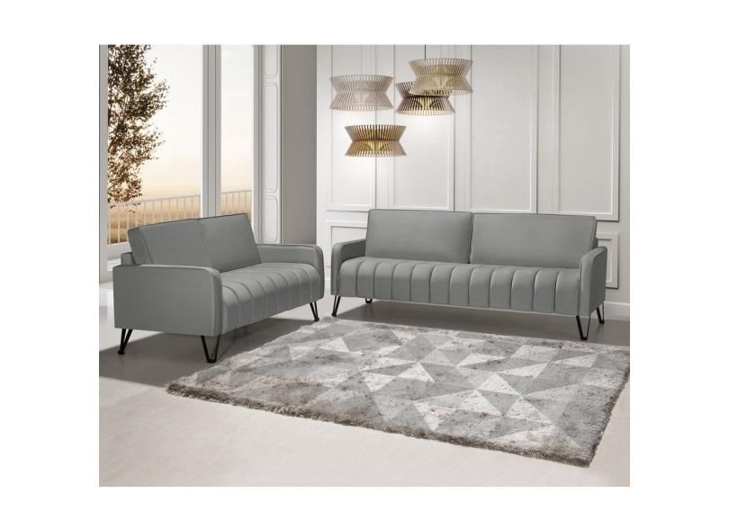 Sofá Living 3 e 2 Lugares Savana - 2,20/1,58mts Com Pé de Ferro Preto - Veludo Cinza