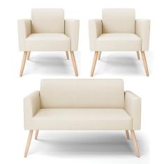 Sofá Namoradeira Com 2 Poltronas Pés Palito Natural Marisa Linho Bege A19 D03 - D'rossi