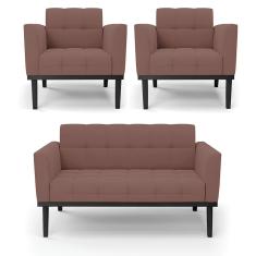 Sofá Namoradeira E 2 Poltronas Base De Madeira Preto Elisa Veludo Rosê D03 - D'rossi