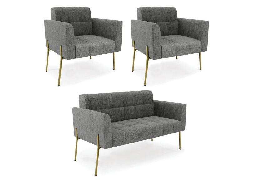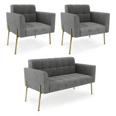 Sofá Namoradeira E 2 Poltronas Pé De Ferro Dourado Elisa Linho D03 - D'rossi Cor A26 Grafite