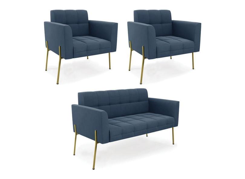 Sofá Namoradeira E 2 Poltronas Pé De Ferro Dourado Elisa Suede D03 - D'rossi Cor Azul Marinho