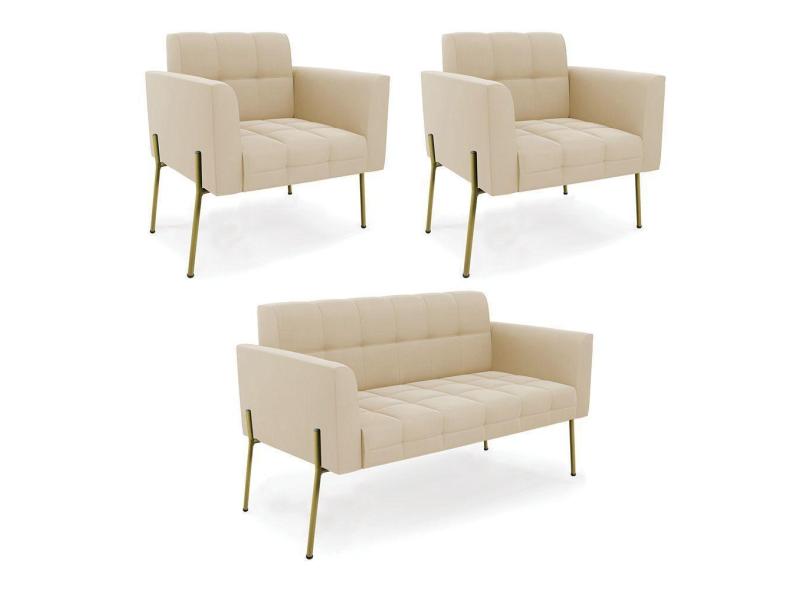 Sofá Namoradeira E 2 Poltronas Pé De Ferro Dourado Elisa Suede D03 - D'rossi Cor Bege