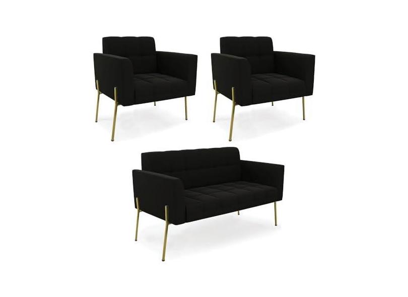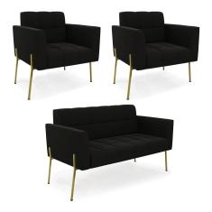 Sofá Namoradeira e 2 Poltronas Pé de Ferro Dourado Elisa Suede Preto D03 - D'Rossi