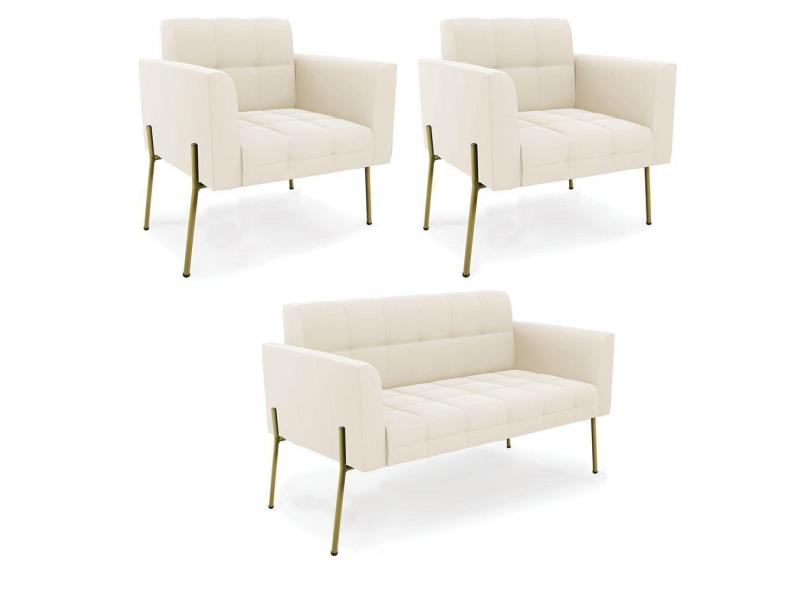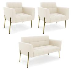 Sofá Namoradeira E 2 Poltronas Pé De Ferro Dourado Elisa Veludo Bege D03 - D'rossi