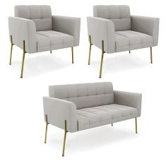 Sofá Namoradeira E 2 Poltronas Pé De Ferro Dourado Elisa Veludo Cinza D03 - D'rossi