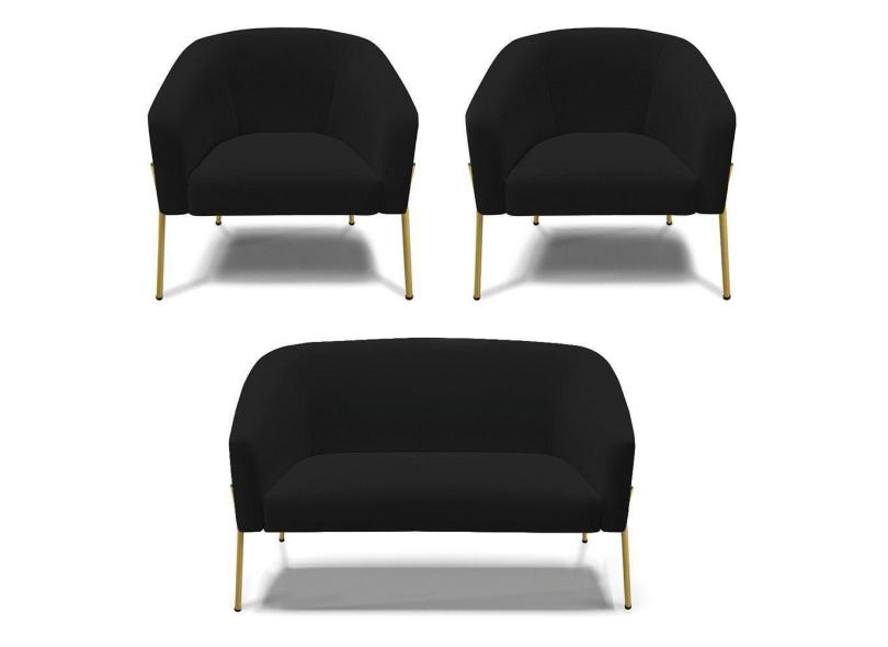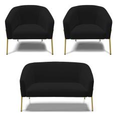Sofá Namoradeira E 2 Poltronas Pé De Ferro Dourado Stella Linho Preto A79 D03 - D'rossi
