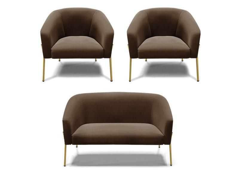 Sofá Namoradeira E 2 Poltronas Pé De Ferro Dourado Stella Suede Marrom D03 - D'rossi