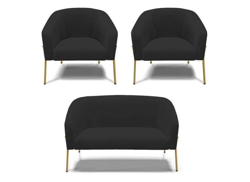Sofá Namoradeira E 2 Poltronas Pé De Ferro Dourado Stella Veludo Preto D03 - D'rossi
