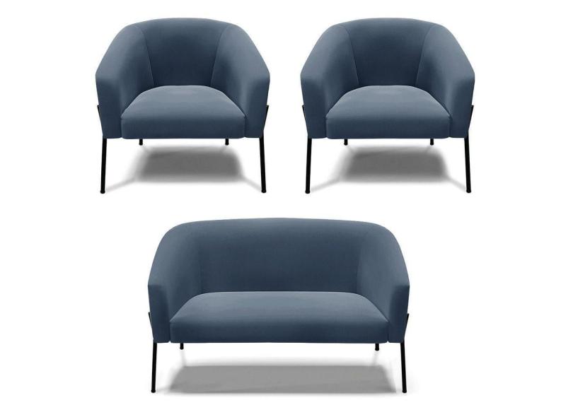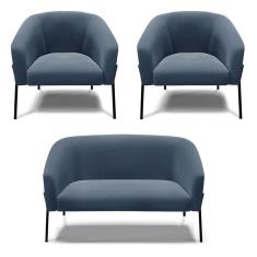 Sofá Namoradeira E 2 Poltronas Pé De Ferro Preto Stella Suede Azul Marinho D03 - D`rossi