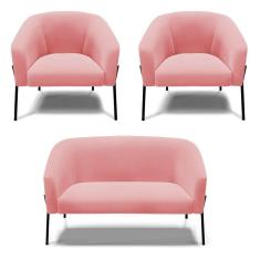 Sofá Namoradeira E 2 Poltronas Pé De Ferro Preto Stella Suede Rosê D03 - D`rossi
