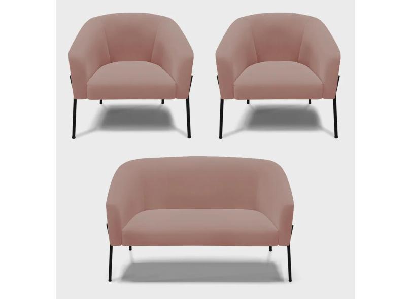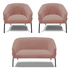 Sofá Namoradeira e 2 Poltronas Pé de Ferro Preto Stella Veludo Rosê D03 - D'Rossi