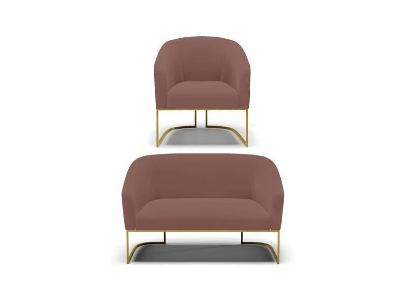 Sofá Namoradeira e Poltrona Base Industrial Dourado Stella Veludo Rosê D03 - D'Rossi