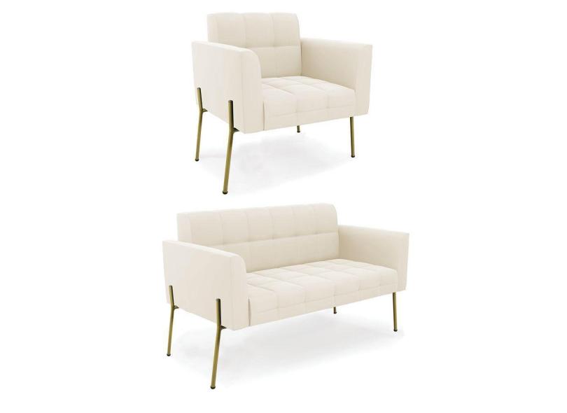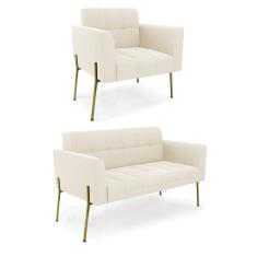 Sofá Namoradeira E Poltrona Base Pé De Ferro Dourado Elisa Veludo D03 - D'rossi Cor Bege