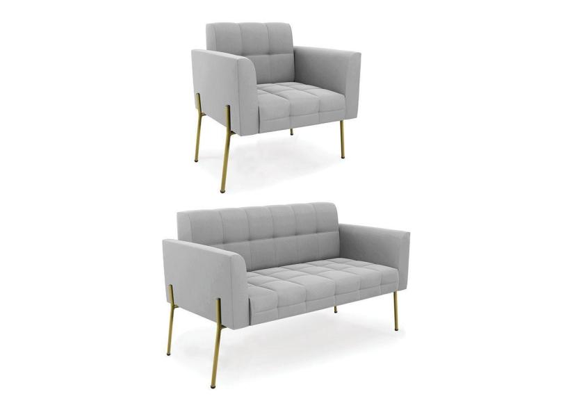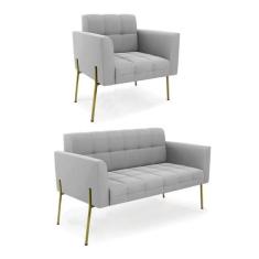 Sofá Namoradeira E Poltrona Pé De Ferro Dourado Elisa Suede Cinza D03 - D'rossi