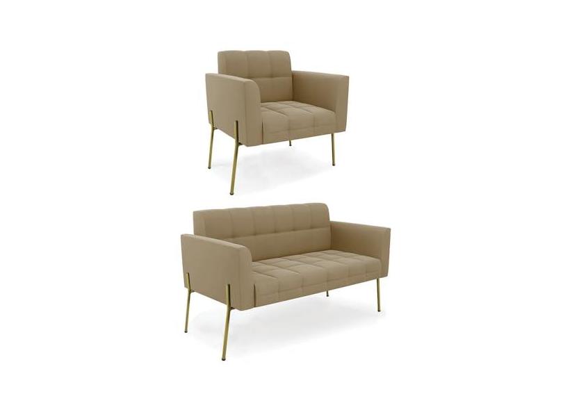 Sofá Namoradeira e Poltrona Pé de Ferro Dourado Elisa Suede Marrom Rato D03 - D'Rossi