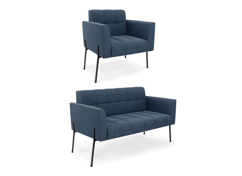 Sofá Namoradeira E Poltrona Pé De Ferro Preto Para Sala Elisa Suede Azul Marinho D03 - D'rossi