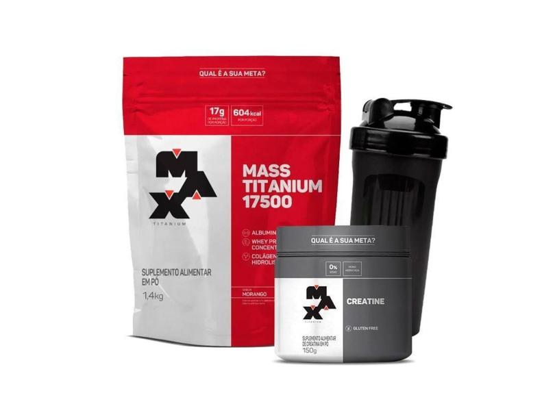 O menor preço encontrado no Brasil para Combo Mass 17500 1,4kg, Creatina 150g e Coqueteleira -Max Titanium-Unissex atualmente é R$ 143,05.