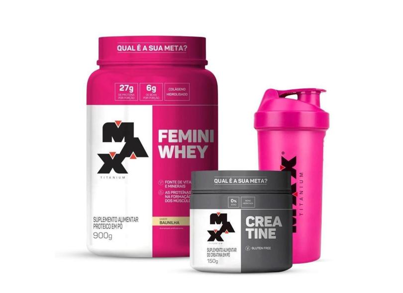 O menor preço encontrado no Brasil para Combo Whey Feminino 900g, Creatina 150g e Coqueteleira 700mL - Max Titanium-Feminino atualmente é R$ 190,55.