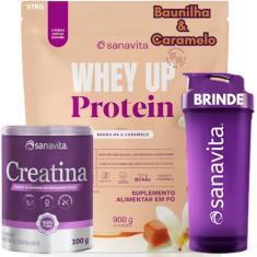 Creatina Monohidratada Pure Whey Protein Up Coqueteleira Sanavita - Kit Whey Up 22g Proteína + Creatina Monohidratada 100% Pure + Coqueteleira - Sanavita - Desempenho Físico - Força - Saúde (Whey Up Baunilha&Caramelo + Creatina 100g Pure)