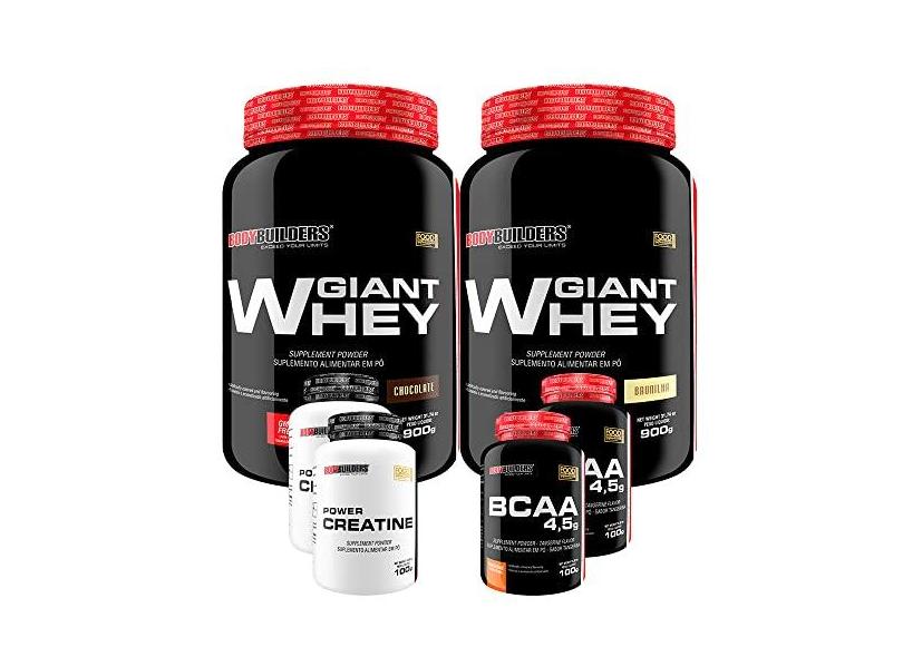 O menor preço encontrado no Brasil para Kit 2x Giant Whey 900g + 2x BCAA 4,5 100g + 2x Power Creatina 100g - Bodybuilders Sabor Chocolate e Baunilha atualmente é R$ 169,90.