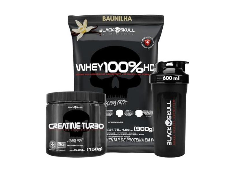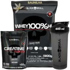 Kit Whey Protein 100% HD Pure 900g Isolado - Hidrolisado - Concentrado Refil + Creatina Monohidratada 150g + Coqueteleira - Black Skull (Whey 100% Baunilha Refil + Creatina 150g)