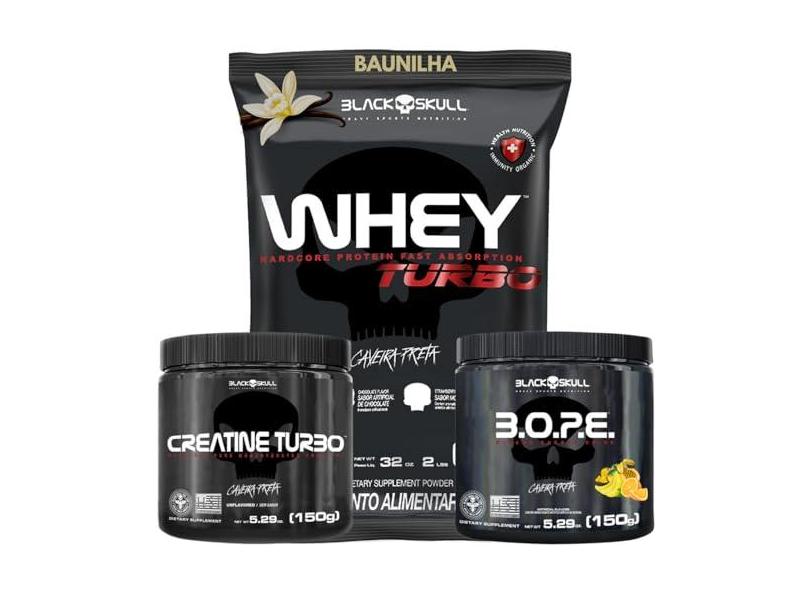 Whey Protein Concentrado + Creatina Monohidratada 150g + Pré-Treino B.O.P.E 150g - Kit Black Skull Para Ganho de Massa e Força (Whey Turbo Baunilha - B.O.P.E Frutas Amarelas)