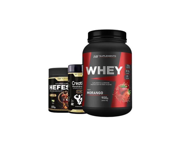 Whey Protein Morango 900G + Pré Treino Limonada + Creatina - Hf Suplem