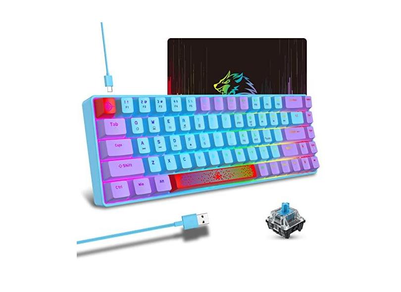 Teclado mecânico 60% com fio, luz de fundo RGB compacto de 68 teclas, teclado pequeno para jogos, anti-fantasma, mouse pad colorido à prova d'água tipo C para Windows, laptop, PC, Mac (interruptor