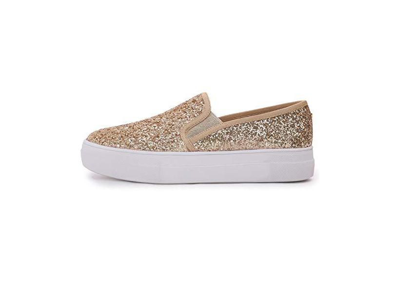FEVERSOLE Mocassins femininos modernos sem cadarço e plataforma casuais, Plataforma dourada com glitter, 35