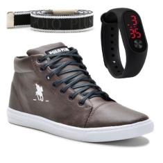 O menor preço encontrado no Brasil para Kit Com Tênis Cano Médio Polo Plus + Relógio Digital E Um Cinto, Marro atualmente é R$ 146,85.