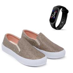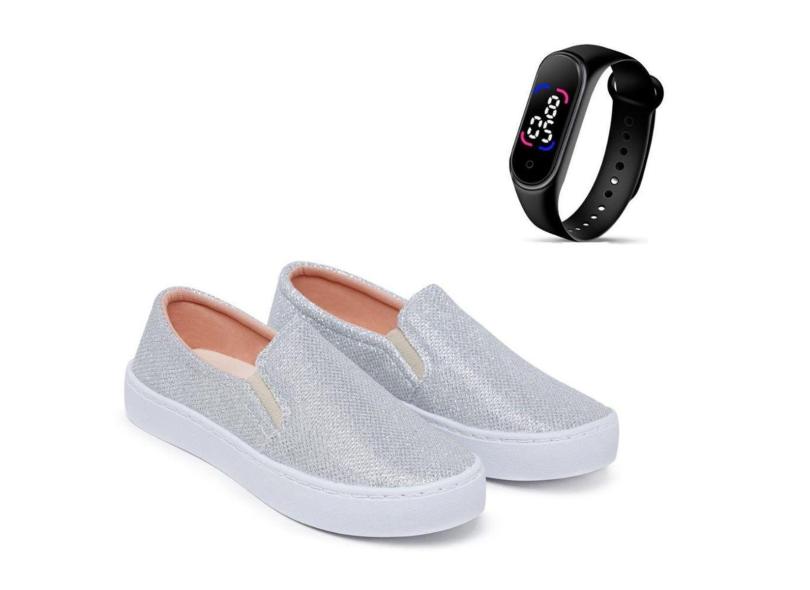 O menor preço encontrado no Brasil para Kit Tênis Casual Feminino Macio Legítimo Slip On com Glitter + Relógio Touch Digital-Feminino atualmente é R$ 99,90.