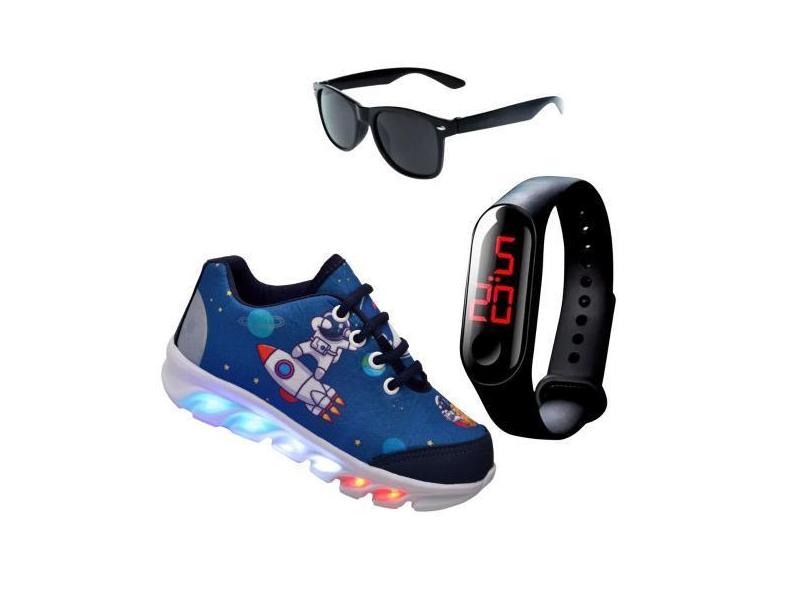 Kit Tênis De Led Infantil Menino Masculino Astronauta + Relógio + Ócul