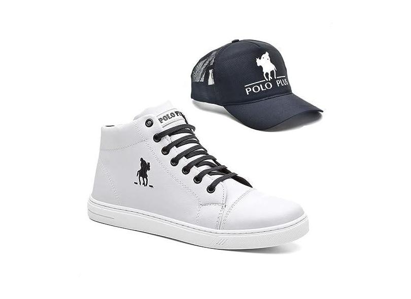 Kit Tênis Polo Plus Cano Médio + Boné Masculino Casual Branco