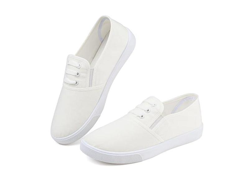 O menor preço encontrado no Brasil para Tênis feminino de lona branco leve com cadarço moderno confortável sapatos de lona cano baixo sem cadarço casual tênis caminhada calçados femininos, Sem cadarço branco, 35 atualmente é R$ 100,21.