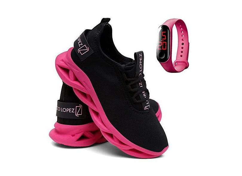 Tênis Feminino Esportivo Corrida Academia e Relógio - Preto/Rosa - 34