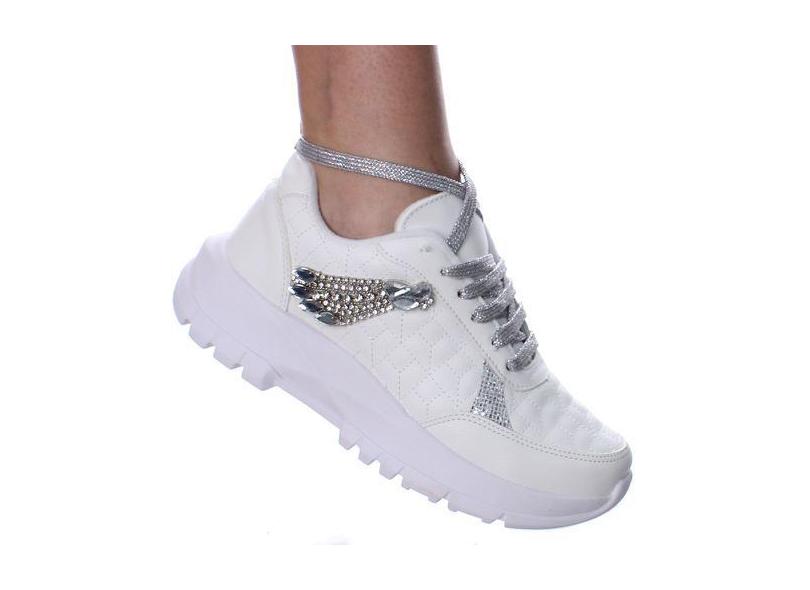 Tenis Feminino Luxo Com Strass Branco Cadarço Prata Brilho - Pemania