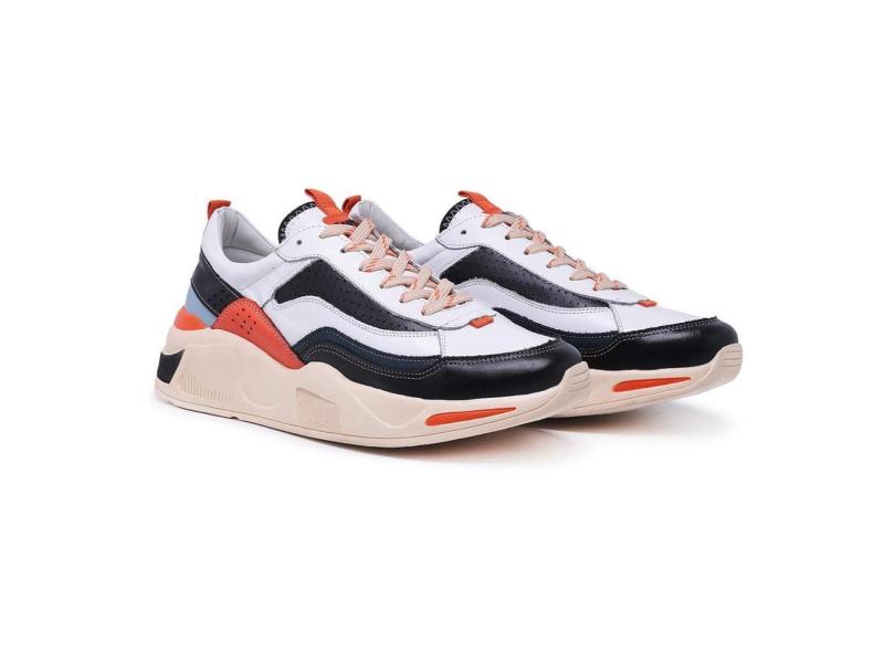 Tenis Sneaker Casual em Couro Masculino com Cadarço Detalhe Recortes e Perfuros-Masculino