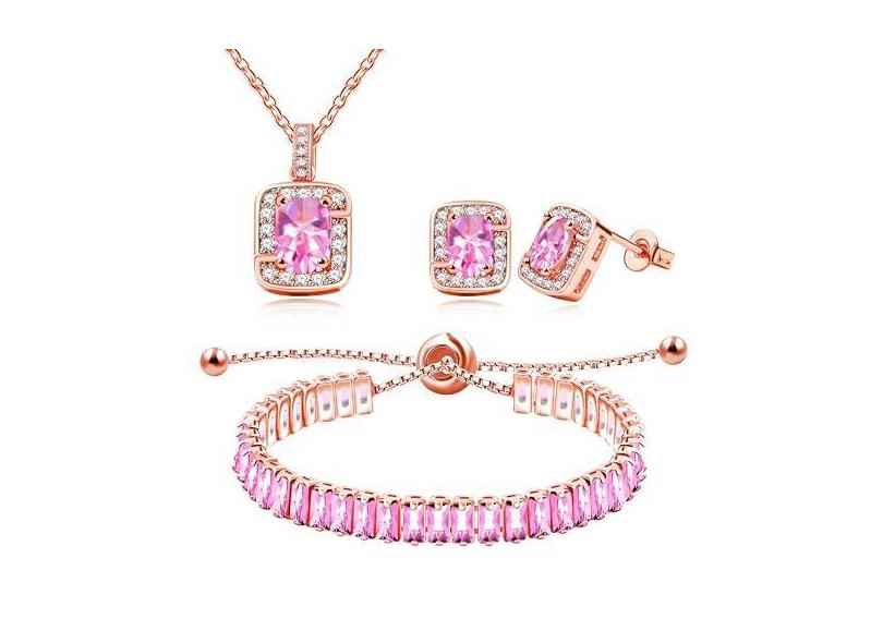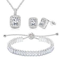 Tobestu Brincos de zircônia cúbica banhados a ouro rosa colar retangular baguete pulseira de tênis conjunto de joias de cristal ajustável, Latão, Zircônia cúbica