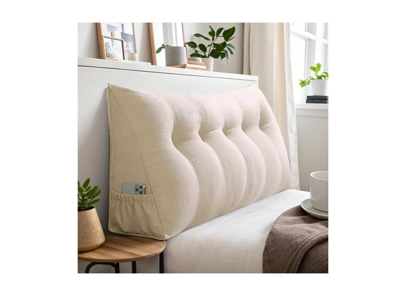 Travesseiro triangular grande para cabeceira com bolso, almofada de cabeceira de linho para sentar na cama, almofada triangular para cabeceira macia e fofa, travesseiro de sofá completo