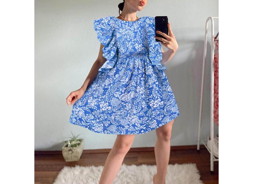 Mini vestido feminino estampado floral verão sem mangas babado para festa casual vestido curto roupas plus size S